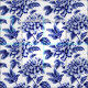 This fabric features a blue and white dahlia flowers toile de jouy pattern.