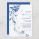 This stunning wedding invitation is the perfect way to set the tone for your special day. The beautiful blue and white design features an ethereal and romantic illustrated floral garland adorned with charming flowers and leafy foliage. The classic typography adds a timeless and elegant touch that is sure to impress your guests. Whether you are looking for a traditional or modern feel, this beautiful wedding invitation will be sure to make an impact. From the romantic floral garland to the classic typography, this exquisite invitation will be sure to make an unforgettable impression. The back includes your initials in white in a frame on blue background.