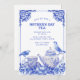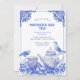 This Mother's day tea invitation has a monochromatic design featuring a blue and white tea set surrounded by birds and flowers. The top has ornate corner decorations. You can edit the text to meet the needs of your event.
