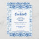 Blue and White Chinoiserie Pattern with Geometric and Botanical Flowers and Leaves.