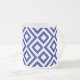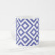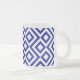 This bold blue and white geometric pattern is an original ornamental design. White meanders angle around dark blue diamonds containing white diamonds. Vibrant blue zigzags provide subtle separation between the winding paths.