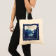 Blue mountains and conifer trees wedding welcome tote bag. A stylish wedding design displaying a square with a dark blue and white mountain range through conifers, your names in handwritten style and a polka dot pattern on dark blue border.