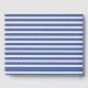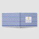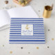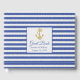 Stylish wedding guest book done in a nautical theme or blue and white horizontal stripes. The front of the guest book has a white square text area, decorated with graphics of a golden anchor. Personalise the custom text fields, for your wedding day.