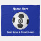 Blue and White Personalised Soccer Blanket / Football or CHANGE background and text to your COLORS. 3 Soccer Blankets SIZES: Small, Medium and Large (as shown). Type in soccer players Name, Jersey Number or Monogram and Team Name or YOUR TEXT or Delete. See Below, * * * Time Saving Tip for MULTIPLE Players and Coaches to personalised ONE soccer fleece blanket at a time. CALL Designer Linda: 239-949-9090 for HELP and Design or Product CHANGES: 239-949-9090
