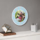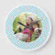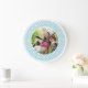 A personalised photo wall clock, with blue and white polka dot pattern, suitable for kids.