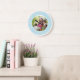 Blue and white round wall clock design, by red_dress, featuring a custom photo and a white polka dot background on blue. White numbers with a pink stroke add contrast to this simple and cheerful round wall clock picture template.