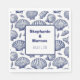 Summer beach house themed paper cocktail wedding napkins with clam, scallop and seashells in blue and white for coastal, nautical theme.