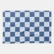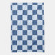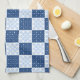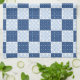 Wintry kitchen towel with snowflakes and ice in a blue and white chequerboard pattern.