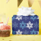 Here’s a fun holiday design with a delightful snowflake pattern. The pattern is made up of blue and white snowflakes on a dark blue background.