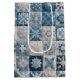 A quilt showcases intricate patterns resembling snowflakes, each block featuring unique blue and white designs