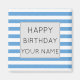 A cool light blue and white striped pattern and a Happy Birthday text template. Click personalise to add your name.