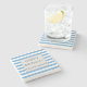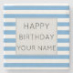 A cool light blue and white striped pattern and a Happy Birthday text template. Click personalise to add your name.