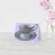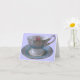 Beautiful blue and white teacup and saucer with pink rose and gold trim.