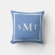 Create your own personalised monogram throw pillow featuring three letter monogram initials in blue colour.