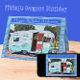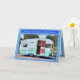 A handsome blue and white vintage camper trailer Happy Birthday card. This fun card, featuring a cute retro RV camping trailer, is framed against a handsome bright blue grid background. The camper is blue, white and red. Above the classic camper is a framed template that reads: Happy Birthday Name. The inside greeting reads: Wishing you a very special birthday and a wonderful year ahead! Underneath the greeting, there is a road sign with arrows which read: Adventure and More Adventure. The unique artwork is repeated on the back of the card along with the wording: made just for you. Be sure to add the appropriate date on the back of this cheerful speciality card.
