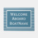 Perfectly chic, and classic blue and white Welcome Aboard _________ doormat for your boat of marina slip customisable with your boats name