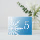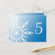 These festive Blue and White Winter Snowflake Table Numbers can be customised for your December, January or February winter wonderland theme marriage reception, bridal shower or engagement party. These classy custom wintery table number cards feature intricate white snowflakes with a blue gradient background.