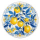 Picture this: a round, smooth surface adorned with a cascade of golden lemons, each one so plump and juicy-looking, you’d swear you could almost squeeze them for a refreshing glass of lemonade. But wait, there’s more! These lemons are nestled among a sea of deep blue leaves, swirling and twirling like they’re at a botanical ball. The whole scene is framed by delicate, whimsical flourishes that could only be described as the doodles of a very talented, very caffeinated artist.