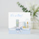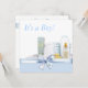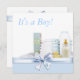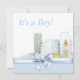Adorable yellow and blue baby boy shower invitation with sweet blue bow wrapped nursery items, baby blocks, diapers, yellow rubber duck, baby bottle and powder. Add your details to the front and/or back by simply choosing the orange "Customise it!" button to begin adding your event details, font style, font size & colour, and wording.