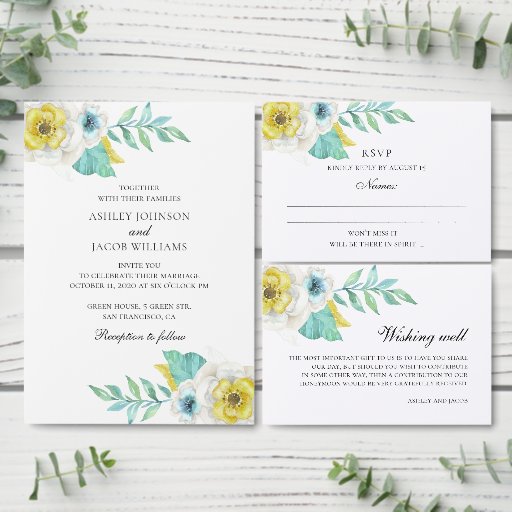 Wedding rsvp with blue and yellow flowers. Contact me, please, if you need additional items.