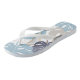 Flip Flops decorated with print of blue and yellow monstera leaves.