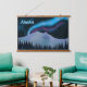 The northern lights shine over a snow-capped mountain on a cold night in Alaska. Text reading "Alaska" also appears in glowing blue and white.