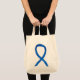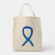 Tote bag features blue awareness ribbon art. The blue awareness ribbon colour means support for ALS, Free Speech, Foster Care Awareness, Colon Cancer, Child Abuse Awareness, Drunk Driving Awareness, Education, Arthritis, Huntington's Disease, Human Trafficking, Stop Bullying, and Save the Music to name a few. Let the blue awareness ribbon help support awareness for these causes!