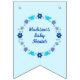 This awesome bunting features a digital art image of a group of flowers and butterflies, each a shade of blue to represent a baby boy. The flowers include Dahlias, water lilies, forget me not and Chrysanthemums.