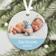 Simply elegant photo ornament for baby's First Christmas can be personalized with a newborn photo and custom text for the first name. Choose to include the same photo on both sides or two different photos. The blue background color can be changed to match your photos!