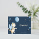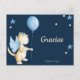 Precious Spanish thank you baby shower postcard to acknowledge your baby shower guests gifts. The postcard has a gorgeous navy blue background where the illustration of a baby dragon with blue wings is holding a light blue helium balloon. To complement the illustration there are some scattered blue stars and yellow circles here and there.