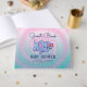 Cute cartoon blue baby elephant with pink flower over pink and blue background with white sparks