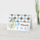A baby shower thank you card featuring a top border of brown and blue argyle. Illustration of diaper pin at left with baby carriage inside circle attached to pin. Text "THANK YOU" at right. Personalise the inside text.