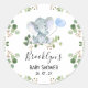 Cute boy's watercolor elephant baby shower sticker featuring a cute watercolor elephant, a blue heart shaped balloon and some eucalyptus foliage. This sticker or label is ideal for a boy's elephant themed baby shower.