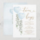 This elegant baby shower invitation features soft sage green eucalyptus, two watercolor blue balloons and modern lettering.