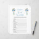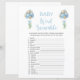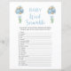 This baby shower word scramble game is perfect for a baby shower or baby sprinkle. This word scramble game features blue watercolor balloons and sage green eucalyptus botanicals. You can personalise this design by clicking on "Personalise this template" or if you wish to change the font, colours or arrange the design elements in a different way you can click on "Edit using Design Tool". Answer Key: 1. Diaper 2. Bassinet 3. Bottle 4. Crib 5. Pacifier 6. Changing Table 7. Stuffed Animal 8. Stroller 9. Rubber Ducky 10. Blanket 11. Teether 12. Formula 13. High Chair 14. Mobile 15. Thermometer 16. Baby 17. Milk 18. Booties 19. One-sie 20. Teddy Bear