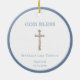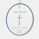 Customisable Baptism ornament keepsake gift, featuring a gold crucifix and blue border.