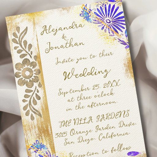 Each element, from the shimmering gold brush accents to the delicate floral motifs and the symbolic hummingbird, tells a story of love, abundance, and celebration. The combination of ivory cream tones with deep blue and metallic highlights evokes a feeling of refined opulence, ideal for destination weddings, hacienda ceremonies, or elegant cultural celebrations.