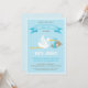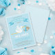 Adorable Blue Baby Shower invitation featuring a stork making a special delivery; a baby bear. This makes a cute invitation for a boy baby shower. Invitation also includes a patterned back side.