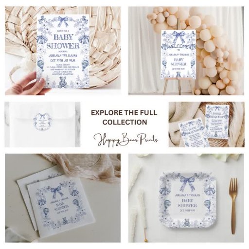 Blue Bear Pumpkin Toile Boy Baby Shower Invitation