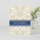Bridal shower invitations in elegant light champagne tan sand brown, dark navy blue and white classic vintage floral damask pattern, chic and feminine, customisable with your shower details. Also available in thank you cards and invitations for the bridal party.