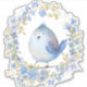 Blue bird in wreath of blue flowers.