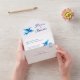 This invitation draws inspiration from the enchanting world of Mexican folk art. Featuring two hummingbirds painted in watercolor, dancing in different shades of blue with a delicate heart, set against a soft and understated white backdrop. Elegant calligraphy typography adds a touch of sophistication, striking a perfect balance between refined elegance and bohemian charm.