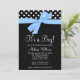A stylish blue and black baby shower invitation. Featuring polka dots and a blue bow graphic. Perfect for a little boy baby shower. Trendy and cute. Easily personalise for your party! Designs are flat printed illustrations/graphics - NOT ACTUAL RIBBON.