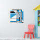 An abstract, geometric design is featured in shapes of bright blue, medium gray, and black on a white background for a mosaic-like look; inspired by the Mid-Century Modern design style.