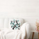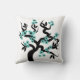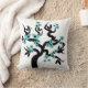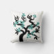 Teal blue and black love birds sakura cherry tree with blossoms throw pillow. It features a light teal blue flower sakura tree with black hearts in the centre and a pair of love birds.