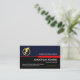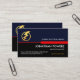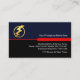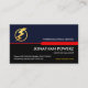 A stylish red border demarcates an upper blue layer against a black piece below. Riding this red border of success is your business name with a gold lightning bolt logo you can use, on the left. Just underneath the red tab lies your prestigious name, the job title with a slogan caption at the base of the card ; You can change the caption remarks to this to suit your own service needs. At the lower left corner is the contact details.