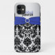 Personalised modern cobalt blue, black, and silver damask Case-Mate Barely There™ iPhone 5 Case with a PRINTED ribbon and jewel brooch.