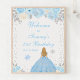 This elegant and glamourous winter birthday party welcome sign features a beautiful princess with blonde hair and fair skin in a blue ball gown. The text combines handwritten script and modern sans serif fonts for a classy and sophisticated look. The floral arrangements, snowflakes and silver confetti create the perfect blend of rustic and chic.