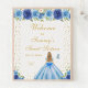 This elegant and glamourous sweet sixteen welcome sign features a beautiful princess with blonde hair and fair skin in a blue ball gown. The text combines handwritten script and modern sans serif fonts for a classy and sophisticated look. The floral arrangements, butterflies and gold confetti create the perfect blend of rustic and chic.