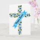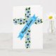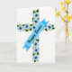 This design shows a floral cross made from soft blue blossoms, with petals fading from pale edges into deeper blue centers, arranged with leafy green sprigs for a gentle, caring look 🌷. Against the white background, the cool colors feel calm and close, like a quiet moment shared between friends. The flowers and greenery are layered tightly enough to feel like a careful embrace, with tiny leaves filling the gaps along the arms of the cross. Light falls evenly across the scene, bringing out the petal gradients and the varied textures of the foliage without harsh shadows. A bright blue banner runs diagonally across the middle, adding a touch of movement as if it has just been laid there by someone thoughtful 🐇. The greeting text sits centered on the banner in flowing cursive-style lettering, standing out in a lighter tone against the blue. A faint shadow beneath the banner gives it a lifted look, hovering slightly over the blossoms and leaves. The blue ribbon angles from upper left toward lower right across the center of the cross.